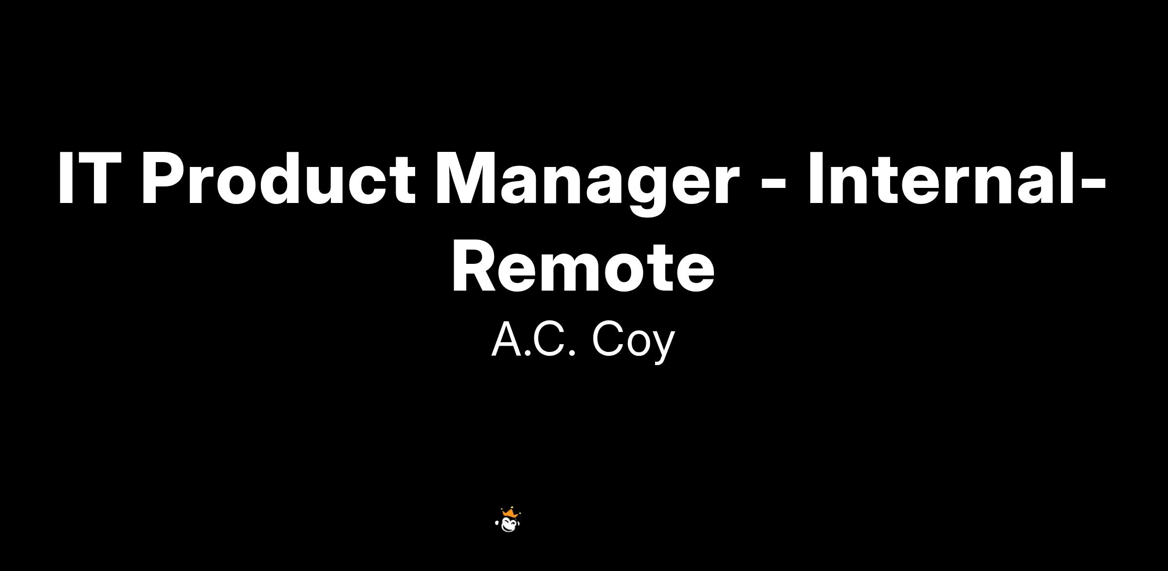 The A.C.Coy company has an immediate opening for an IT Product Manager - Internal.Β Ideal candidates must have a Bachelor's degree in a technical discipline and a minimum of of 3 years of product management experience leading the technical aspects of internal communications products, specifically related to intranet platforms and digital signage solutions as a global, enterprise - level.Β